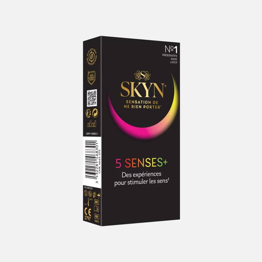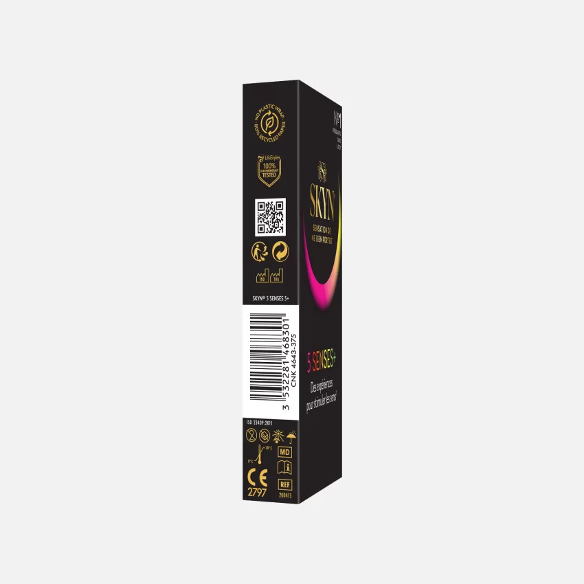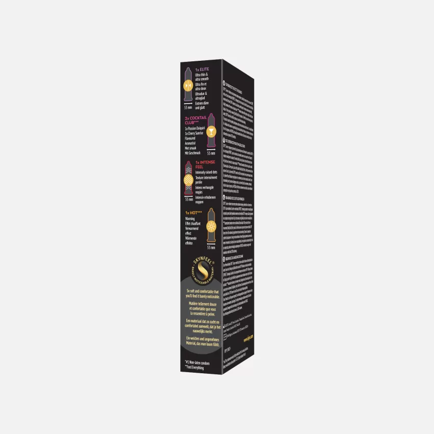 Discover the most thrilling moments with the finest SKYN experiences: this box includes one Intense Feel wave textured condom, one Cocktail Club Passion Daiquiri flavoured condom, one Elite premium thin condom, one Hot condom lubricated with warming gel and one Cool condom lubricated with a cooling gel.