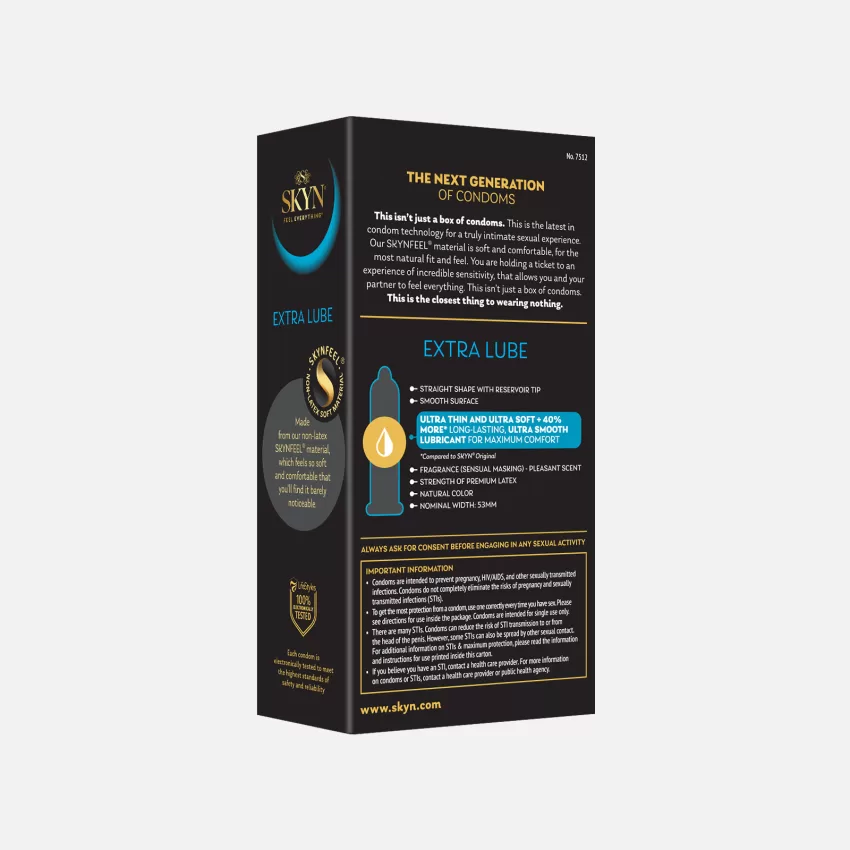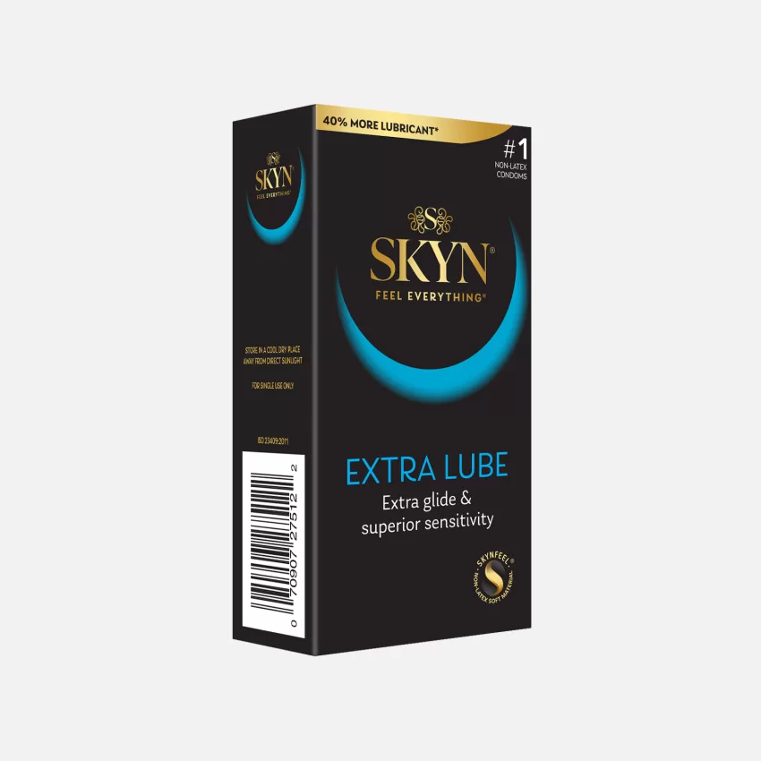 SKYN Extra Lube condoms come with 40% more long-lasting, ultra smooth lubricant than our standard SKYN Original condoms.