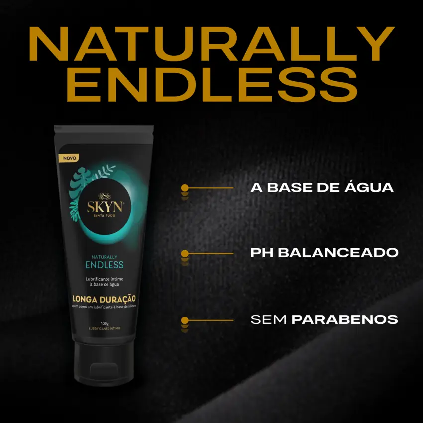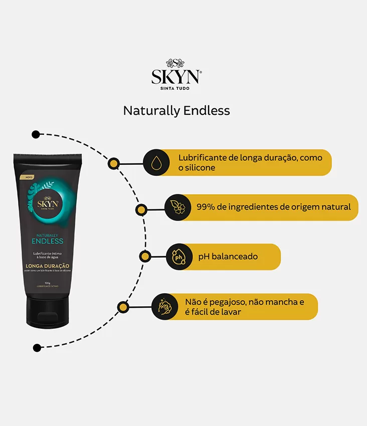 • SKYN® Naturally Endless é um lubrificante pessoal para aplicação vaginal e peniana, destinado a hidratar e lubrificar, aumentar o conforto e complementar a lubrificação natural do corpo